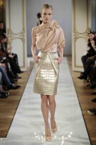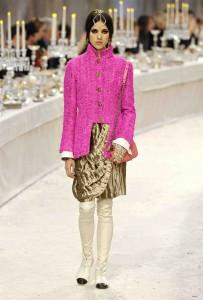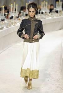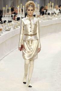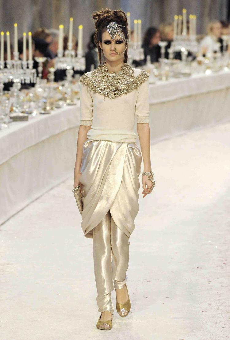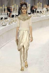 Chaque année depuis 2002 Chanel rend hommage au travail des artisans dans une collection spécifique. Après des voyages imaginaires sur les routes de Byzance, Shanghai ou Moscou ; c’est aujourd’hui les chemins de Bombay. Hommage est rendu aux fastes de l’Inde, au style de ses vêtements dans une collection très Chanel au final, mais avec des réminiscences d’inspiration de sari revisité, de drapés. L’évocation maharadjah se redécouvre dans des silhouettes masculin-féminin où l’un pourrait être l’autre. Les turbans ponctuent les silhouettes d’une touche d’exotisme tandis que les bindi oblitèrent le front. L’atchkan, veste de brocart à col Nehru, se décline et se transforme, paré de brillants aux éclats brodés.