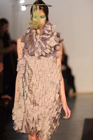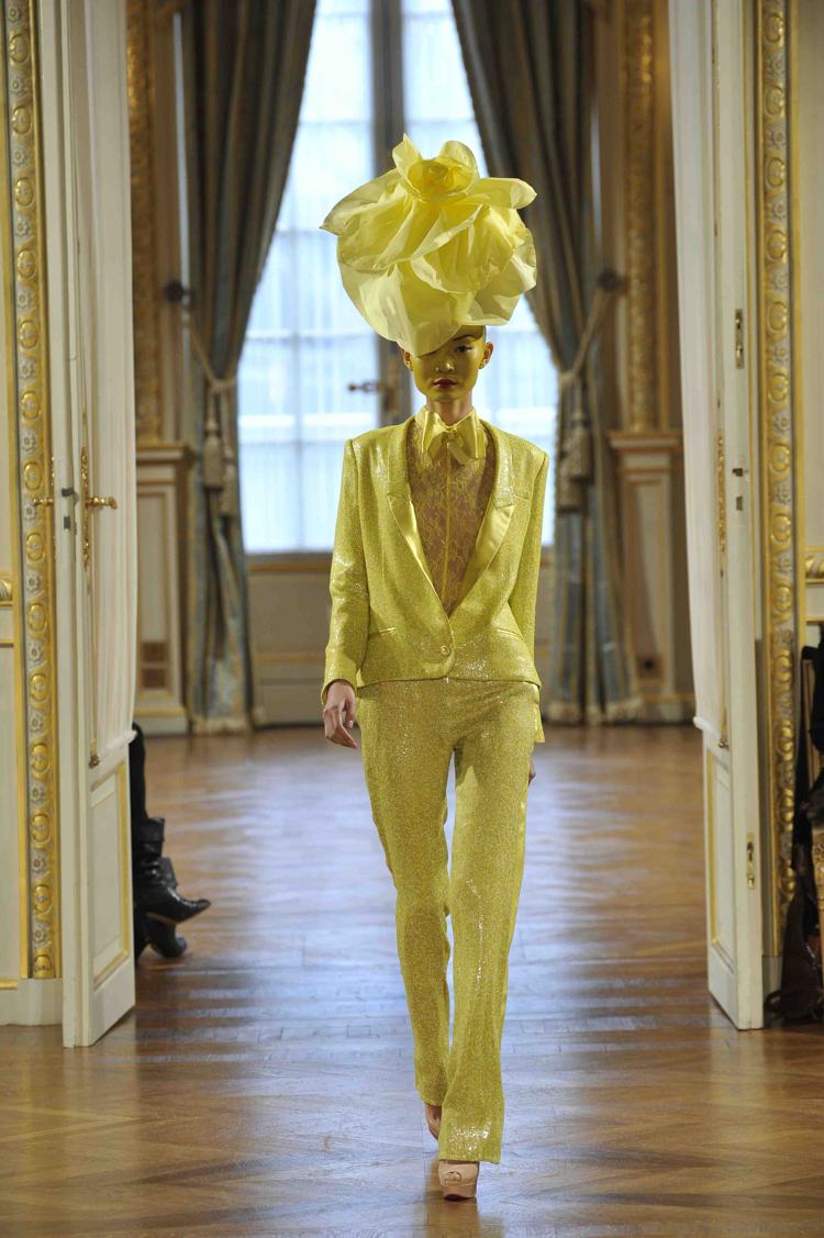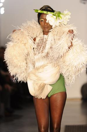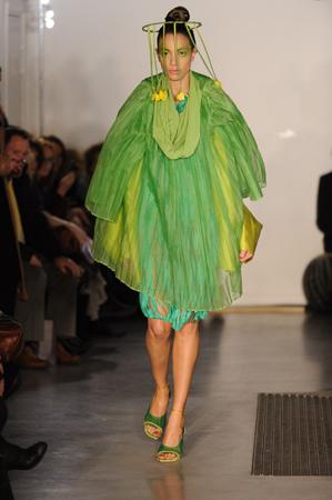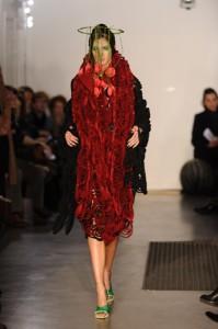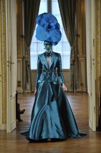 Le vert est mis, un soupçon de chlorophylle rend hommage à mère nature ; « Herbarium Magnifica » est le titre de la collection. Mais noir c’est noir avec ses étonnants manteaux d’arabesques, cocons sombres et travaillés. Des matières nobles et aussi la fantaisie de pièces en mousse synthétique pour composer d’étonnantes mosaïques. Rubans assemblés, spirales dessinées, détails superposés façon post it, volutes… entre le végétal et l’animal, une construction organique où le travail est précieux, raffiné. Un vrai esprit couture préside à la création. A souligner aussi sur les coiffures de Jean-Claude Gallon des bijoux de tête ornés de végétaux qui viennent oblitérer le visage donnant une allure ethnique et baroque aux silhouettes.