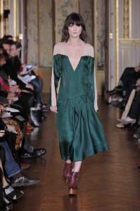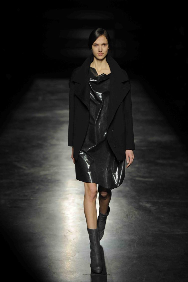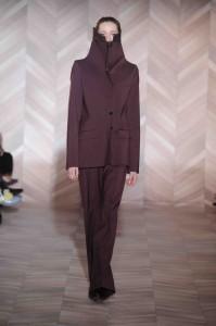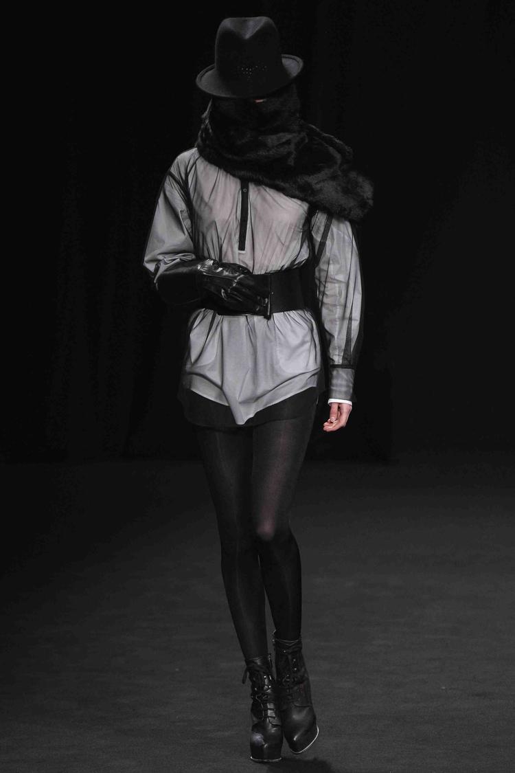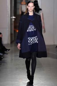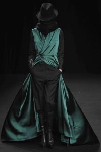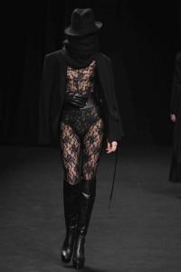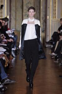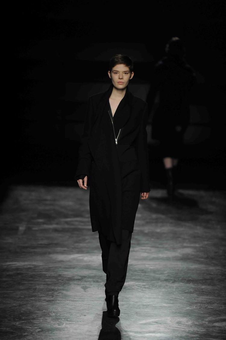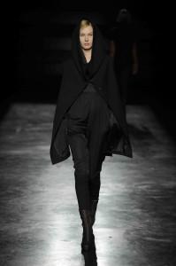 La créatrice belge est à la mode ce que le rock est à la musique. Au fil des saisons, Ann Demeulemeester a construit une histoire très personnelle. Téméraires, ses femmes oiseaux ont l’allure punk et déterminée. Le cuir est à l’honneur, il gaine les bras et les jambes de leggings ou de cuissardes et de gants parfois très longs. Les robes se drapent dans de subtils jeux d’asymétries où le biais a droit de cité. Les vestes multiplient les effets de pliages. S’ajoutent des lanières. Parfois les matières brillent et s’échappe de l’oeuvre au noir un bleu royal et scintillant. Des effets volantés ajoutent une féminité en pointe. Silhouettes de capes et hauts cols. Les vêtements, parfois, se jouent de zips, corps avec vue. Des coupes toujours superbement construites et un magnifique travail du cuir. Les aventurières sont entrées dans Paris.