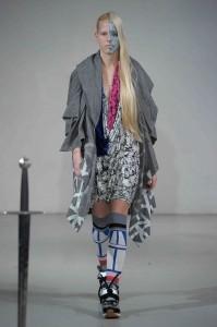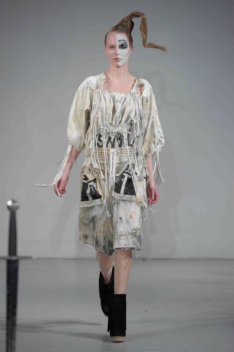 Etonnants, les maquillages se posent sur des demi-visages, presque clownesques, mais parfaits pour la mise en valeur des modèles. Andrew Gallimore pour MAC. Des cheveux laqués dressés en asymétrie par Lyndell Mansfield pour Bumble and Bumble.