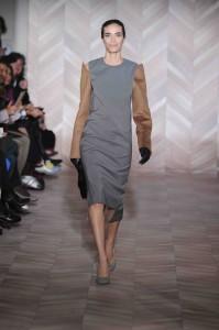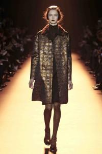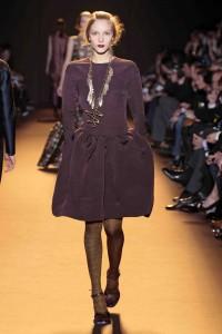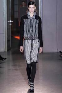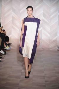 Rétro et colorée, c’est ainsi que pourrait se percevoir la collection de Rochas ; pourtant Marco Zanini est parti cap vers le Nord, s’inspirant de la céramique scandinave et plus particulièrement de l’oeuvre d’un artiste suédois, Wilhelm Käge. Le choix de belles matières, très travaillées, inscrit Rochas dans la continuité de la couture et de l’élégance. Très réussies, les harmonies de couleurs se parent de motifs géométriques irréguliers qui viennent dessiner des damiers. Parme, framboise, turquoise, vert,… la palette est chatoyante.