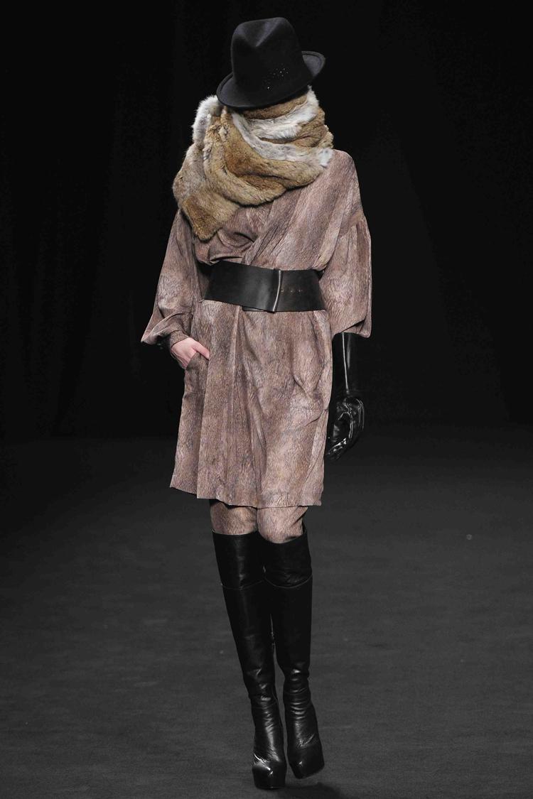 Le duo belge signe une collection d’hiver avec humour dans une présentation où les mannequins défilent visage emmitouflé dans des écharpes, des foulards, de la fourrure. Chapeautées de façon masculine (des trous dans le feutre), les filles progressent sur le podium. Dans ce total look, le visage reprend en masque le tissu ou la matière du vêtement. En photos, sur fond noir s’ajoute une inquiétante étrangeté de modèles femmes sans tête. Un imprimé animal, photo de fourrure ? Jeux de transparence.