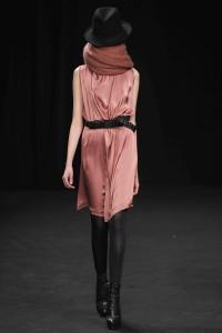 Des couleurs sourdes et du noir. Deci delà se redécouvre leur signe de croix rouge en logo. Une silhouette fluide, décontractée. Robe rose satin à effet drapé, couleur chair. Esprit lingerie dans la robe en dentelle noire tout en transparence.