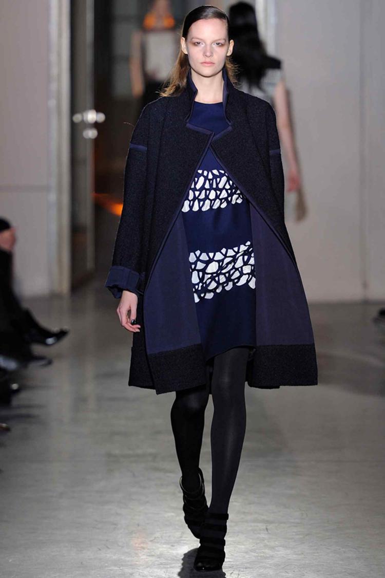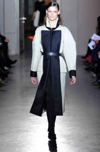 Pour l’hiver prochain, Lutz signe une très belle collection. Un vrai défilé de saison avec des pièces dans lesquelles madame rêve de s’envelopper dans ces volumes amples et confortables. Le créateur a imaginé les frimas, une pluie soudaine et le geste de se protéger, de s’emmitoufler. On remonte le col et on s’enfonce dans la douceur. Du volume en haut et puis des pantalons et de longs gants. Un jeu sur le vêtement puzzle, un blouson de biker oversized ou une veste aux manches coupées à porter avec de longs gants. Lutz renoue avec ses classiques et son vocabulaire ainsi les pantalons à taille très haute, l’influence du sportswear, sans oublier un subtil jeu de dézippage avec ouvertures sur le corps. Avec les grands cols, des effets de capes, des cagoules, des drapés, belle « robe-sac » asymétrique. Noir et bleu, un beau mariage. Noir « repeint » de blanc. Laine, cuir et fourrure, mais aussi des transparences pour la légèreté. Un style décontracté, mais avec élégance et chic. Vivement l’hiver.