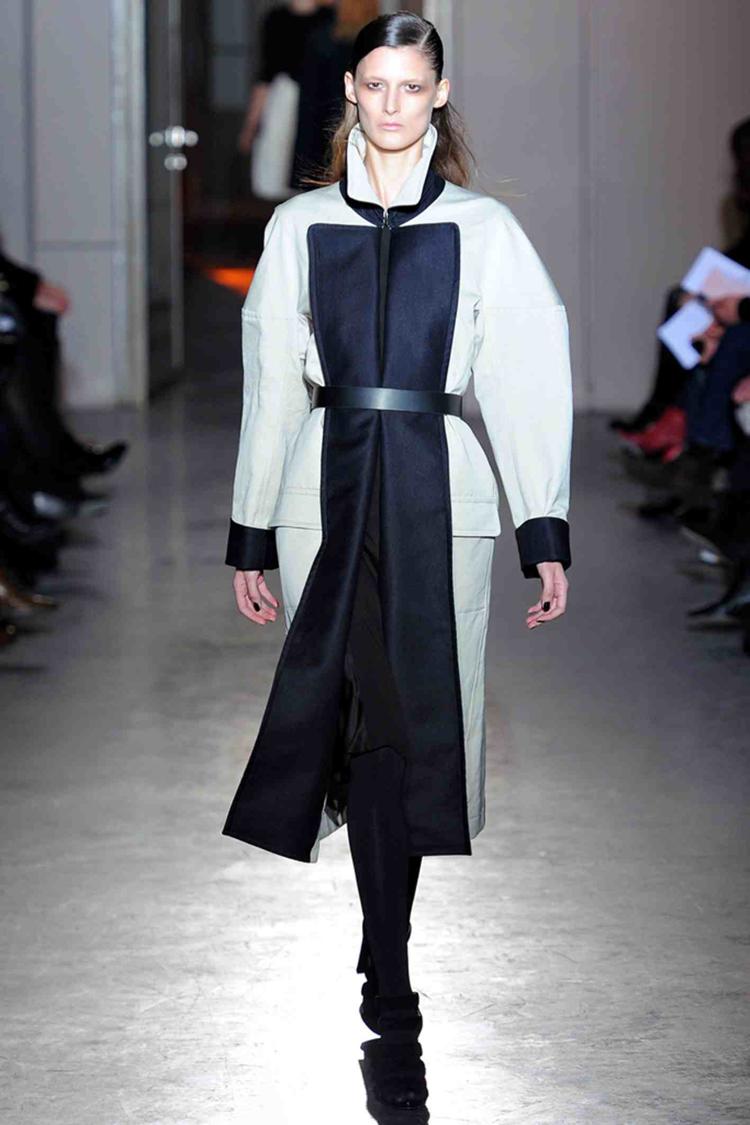 Le noir se dessine sur le blanc, hyper graphique. Très beau top avec incrustation façon marqueterie comme la créatrice sait le faire. Elégant manteau beige avec panneau bleu, géométrique.