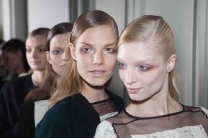 Maquillage Kakuyasu Uchiide pour Shu Uemura, un teint le plus simple possible avec juste une touche d’éclat et pour le côté masculin-féminin pas d’ombre sur la paupière (trop glam) mais sous. Eugene Souleiman pour la coiffure, strict et structurée et puis floue en bas.
