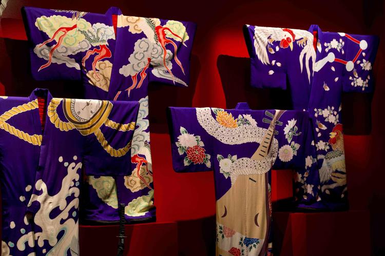 La variété des motifs donne aussi à voir la nature telle que les Japonais la représentait avec ses symboles et aussi les événements historiques qui ont été utilisés en guise d’inspiration du théâtre kabuki. Autour des kimonos sont présentés des accessoires (ombrelles, getas, éventails) et des estampes.