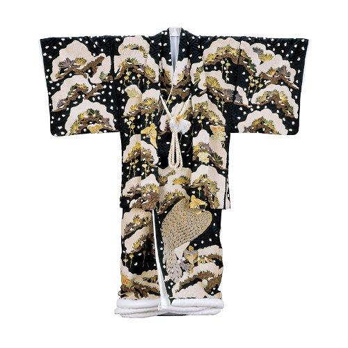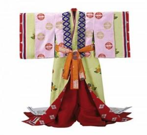 Costume de cour, ce modèle incarne un vêtement de la période de Heian dans une pièce inspirée du Genji Monogatari (importante oeuvre du XIè siècle écrite par une femme). L’inspiration du Genji est arrivée tardivement sur la scène du kabuki en raison des lois somptuaires (trois pièces dans les années 1950). Modèle à motifs de fleurs et dragons des années 90.