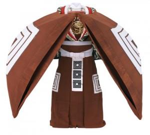 Kamakura Gongoro Kagemasa de la pièce Shibaraku, costume du guerrier courageux qui intervient pour empêcher une exécution. Des couleurs sobres, mais une forme arrondie et un décor d’armoiries. Années 80.