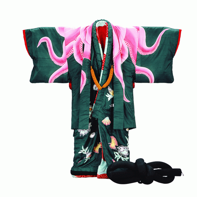 Dans la pièce Shibaraku également un personnage de grotesque, Kashima Nyudo Shinsai avec un magnifique poulpe et des coquillages (modèle des années 80). Le poulpe est un élément important de la culture culinaire et humoristique du Japon ainsi l’Oodako de Dragonball ou encore un des personnages de L’été de Kikujiro de Kitano surgissant de l’eau, coiffé d’un poulpe.