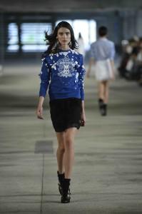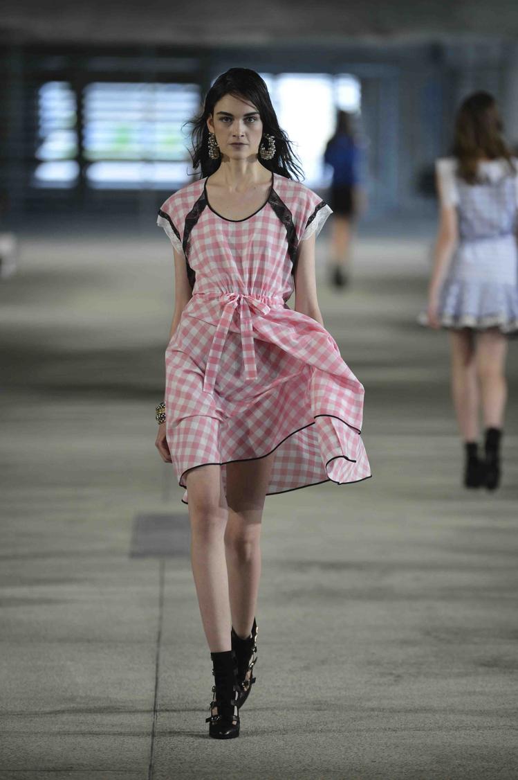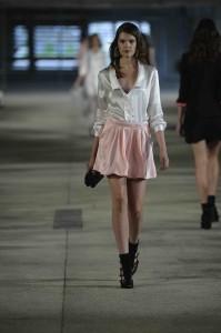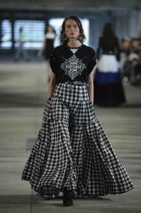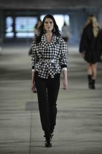 Ex fan des sixties, Alexis Mabille remet à l’honneur le vichy (souvent associé à Brigitte Bardot, aux carottes et à d’autres…). Revisité, le vichy prend un coup de jeune mixé à d’autres matières. Du vichy rose, du bleu et du noir mixé avec du coton, des dentelles. Dans la collection se redécouvre le goût du créateur pour le masculin-feminin dans des tailleurs pantalons. Des superpositions de tissus se jouent de transparence, se féminisent de touches de dentelles.