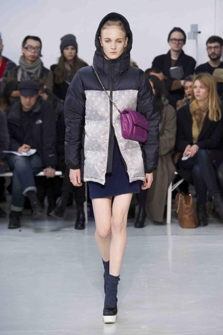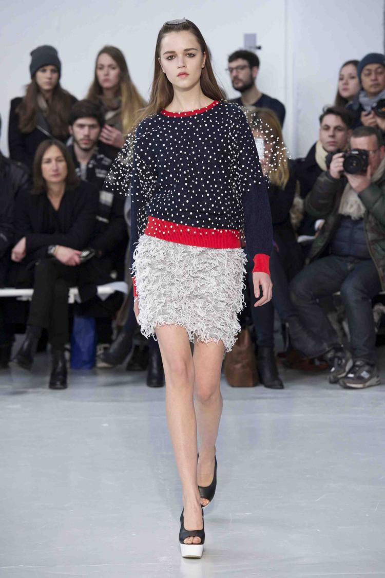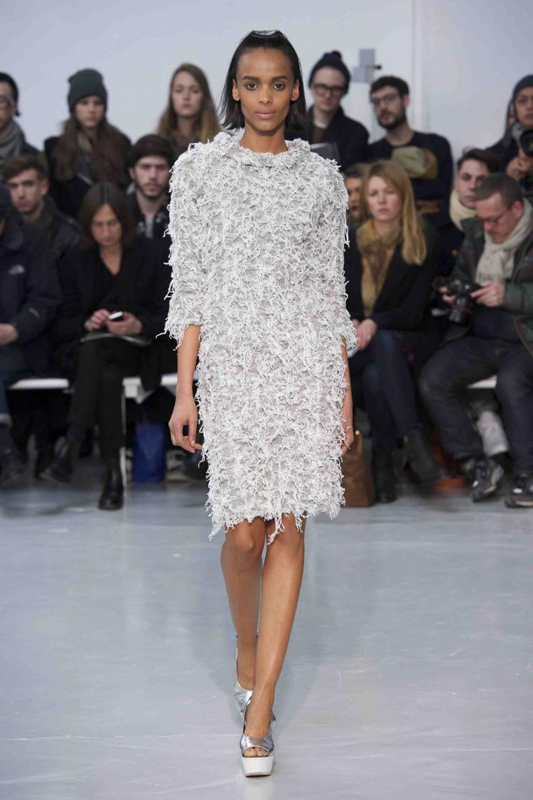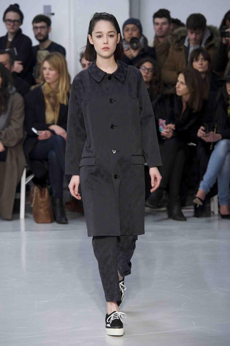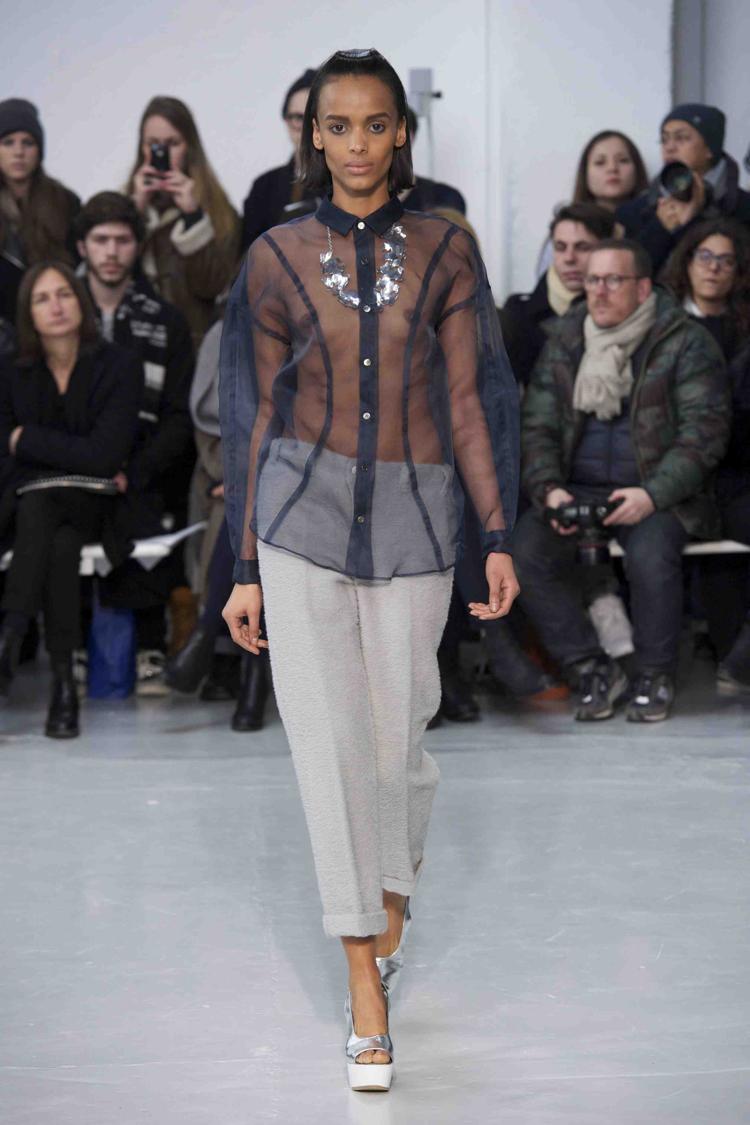 Un travail sur les matières travaillées, parfois de façon très texturée avec nylon et laine bouillie. Quelques silhouettes superposent des pièces en plumetis, légères et délicates, oblitérant de pois le tissu uni. Des effets de transparence se découpent en détail sur les manches ou composent chemises et robes. Opposé aux manteaux d’hiver, un esprit léger, une maille arachnéenne, mais dense. Des manteaux droits, zippés. Une allure juvénile.