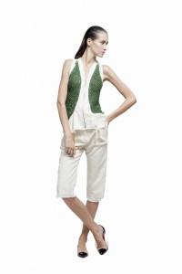 Son choix de couleurs est toujours discrètement raffiné notamment le mélange de l’ivoire et du vert kaki. S’ajoute un zeste de zips. Quant au choix d’une présentation plutôt qu’un défilé, il est parfait pour apprécier de près le travail.