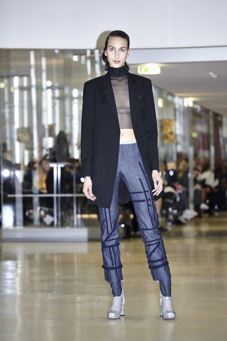 En opposition à la féminité, le masculin des pantalons, l’esprit des costumes. Structure, asymétrie et légèreté. Surlignage en nervures qui semblent dessiner des patchworks de vitraux monochromes. Denim toujours.