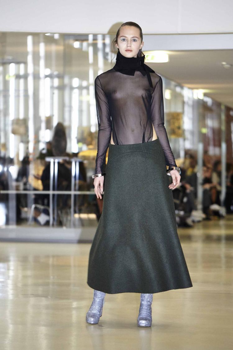 Une pointe de violet se susurre entre bleu et noir. Superposition, pantalon sur jupe, jeu de longueurs, nonchalance élégante de « tranche napolitaine » en camaïeux. Entre deux, le corps s’invite, peau à nu. Transparences en aquarelles colorées.